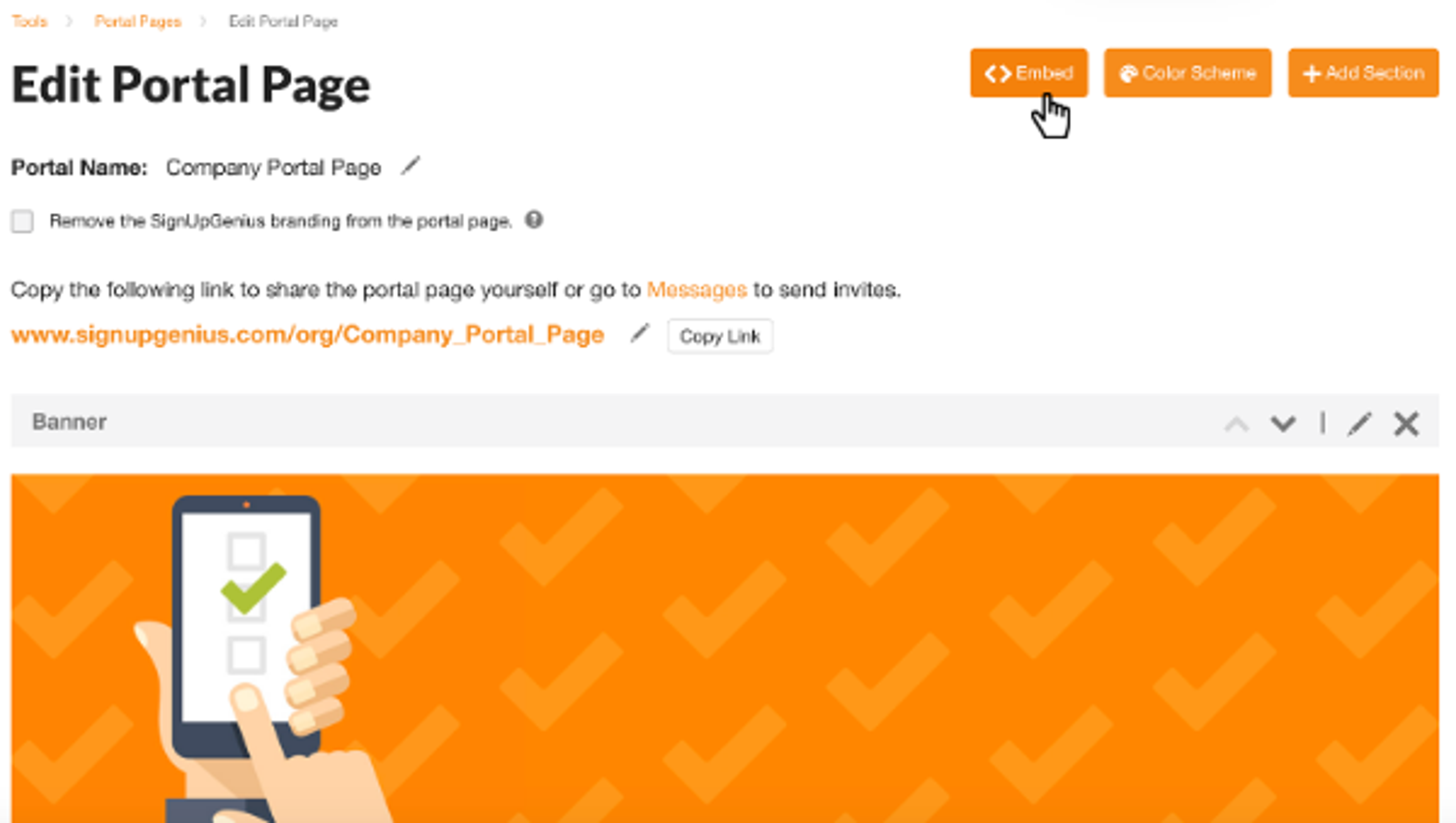 Want to embed sign ups on your website? With portal pages, you can! When you paste an embeddable code snippet into your source code, participants won't need to leave your site in order to interact with your sign ups.