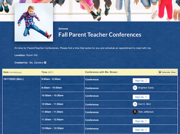 Our school started using SignUpGenius last year for parent teacher conferences. This site has saved our teachers and parents so much time, and best of all, it saves paper. SignUpGenius should be the only way to sign up for parent teacher conferences.