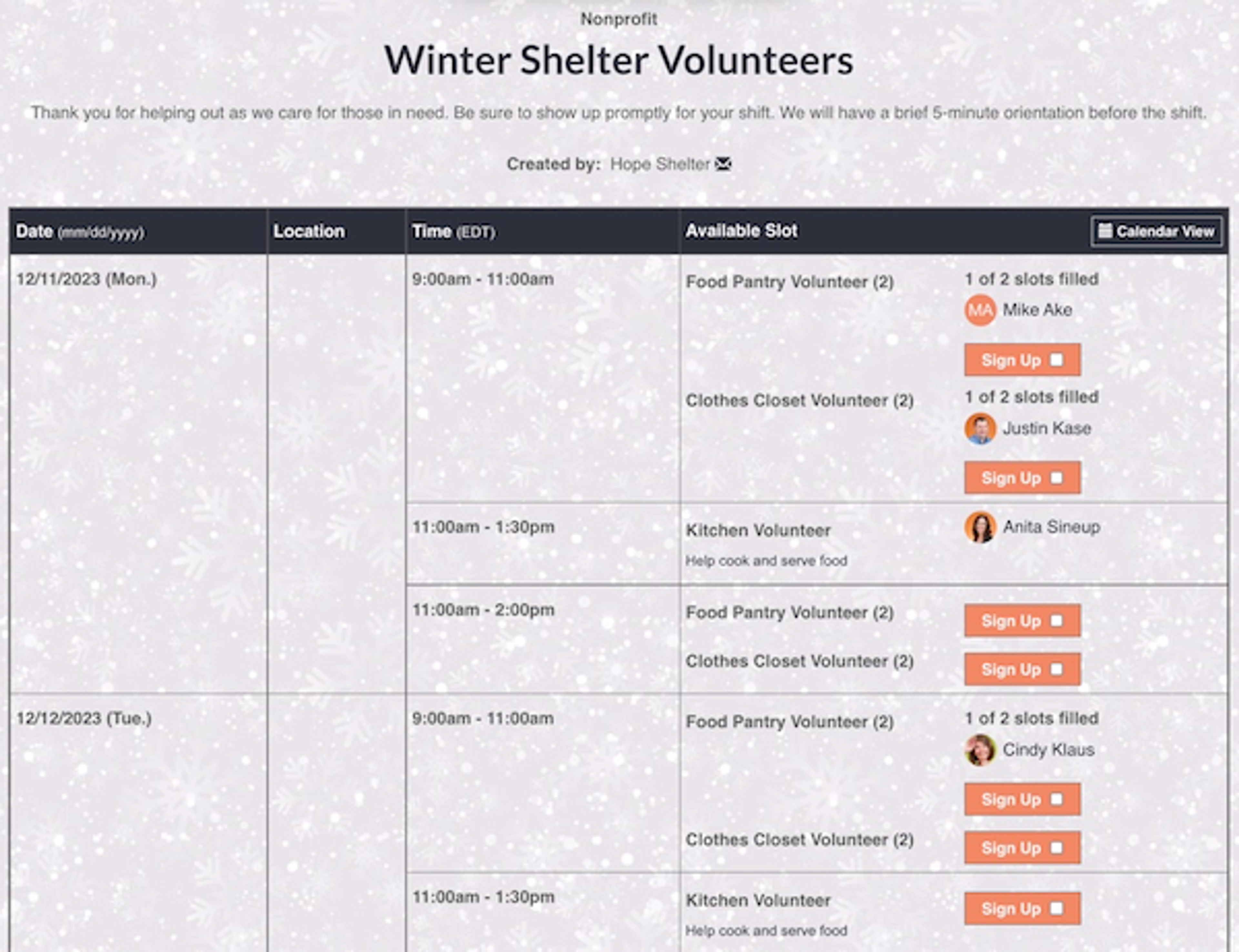 Nonprofits count on volunteers to support their work serving communities and the world. Organizers can automate time slots to simplify the time-consuming tasks of recruiting and coordinating volunteers. Whether it's daily shifts to serve shelter meals or monthly park clean ups, you can schedule recurring volunteer shifts in just a few clicks.