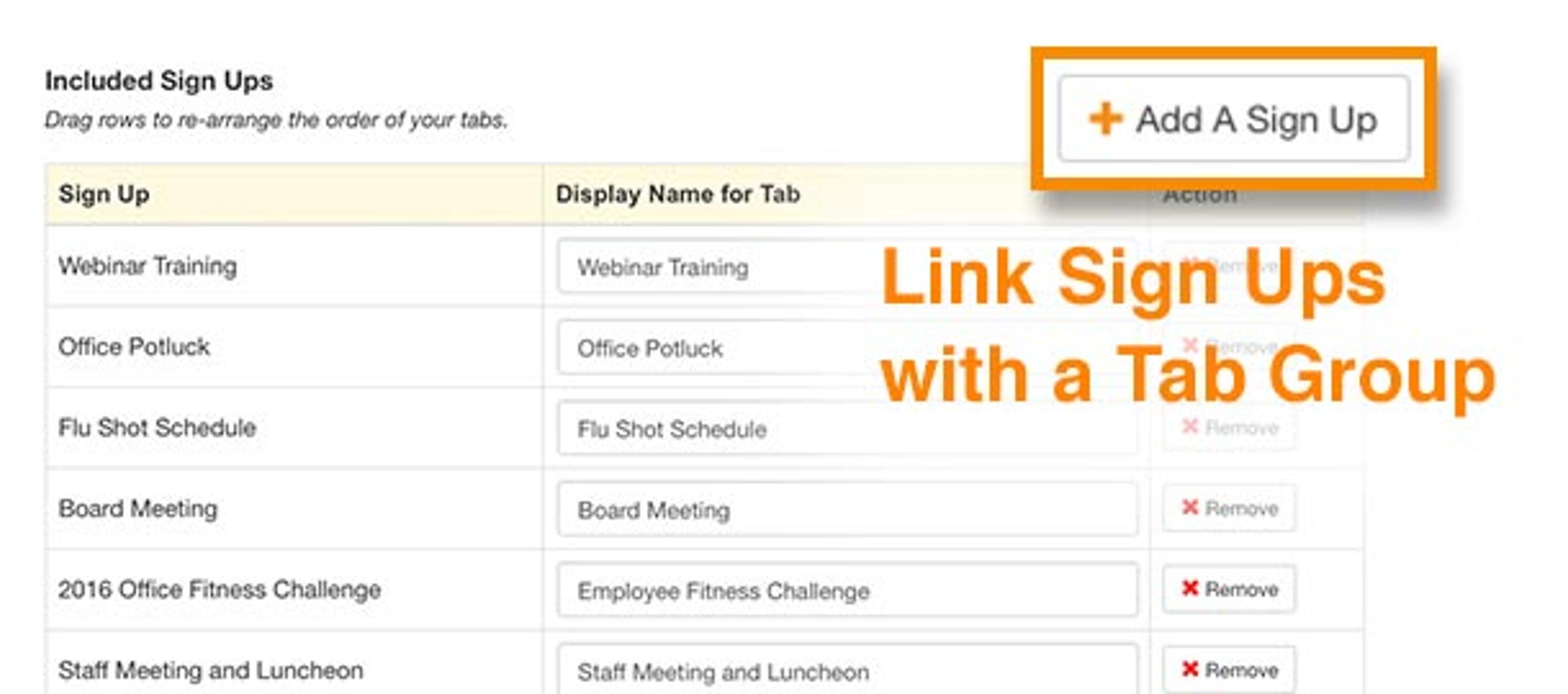 Don't worry — if you create a sign up later that you want to add, you can edit the tabbed group in the same location. (You can also delete tabs if a sign up becomes irrelevant or outdated.)