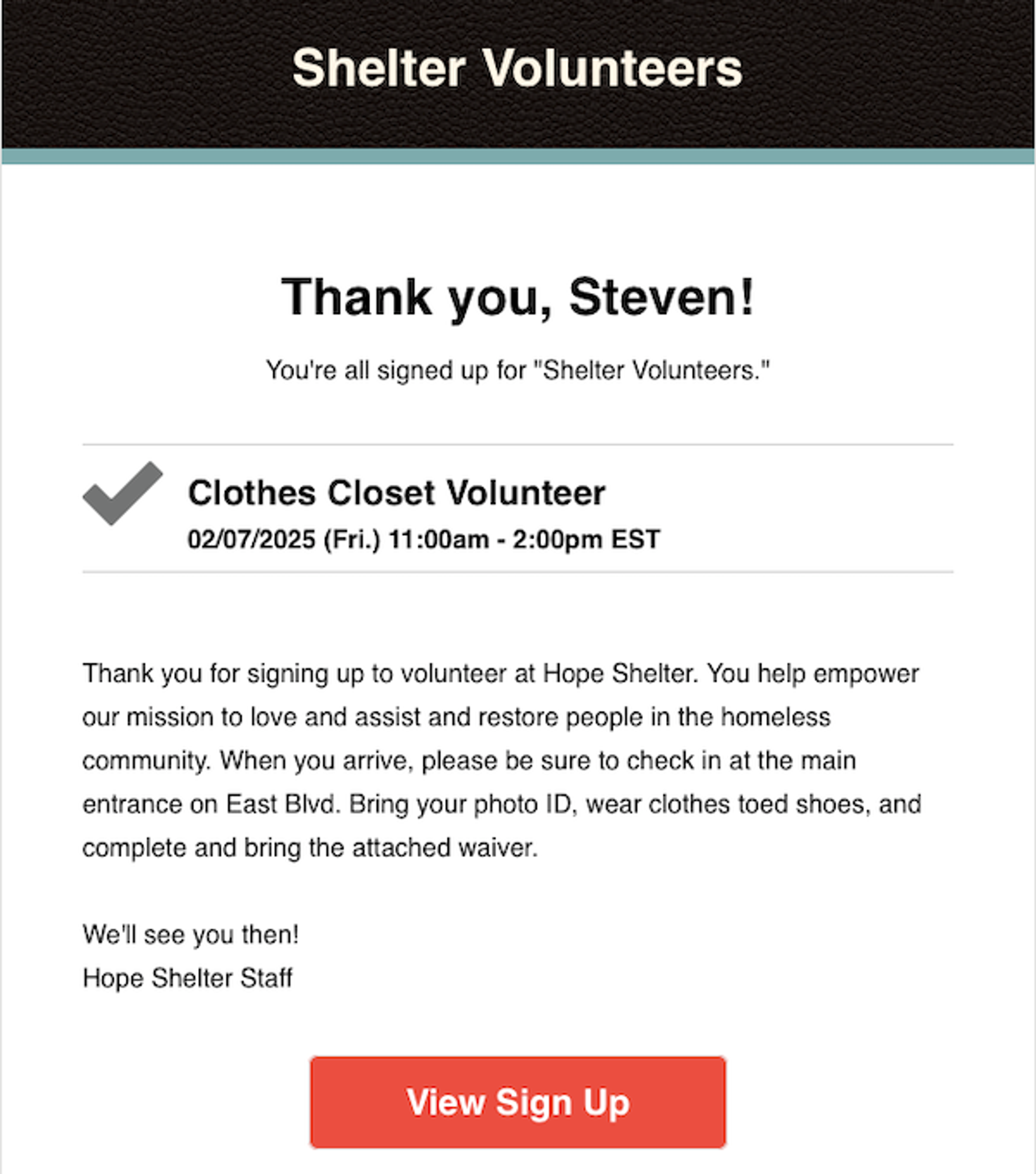 Volunteers are no different than any of us, and with the back and forth of daily life, it can be easy to lose track of time and details. Stay ahead of any potential mistakes in the future by setting up custom reminder and confirmation notifications. If you think your contributors are more likely to check their phones, go ahead and schedule text message reminders to keep your charity top of mind.